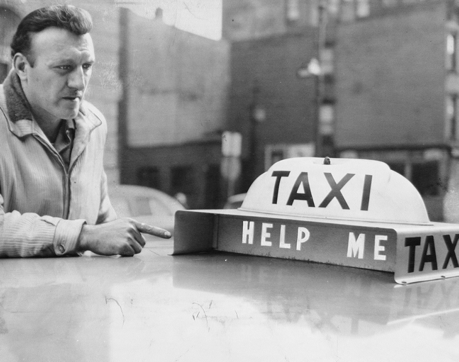 Taxicab driver George Blum looks at a “Help me” sign atop a cab. Today, cabbies in trouble can activate an amber light on the rear to alert other drivers of an emergency.