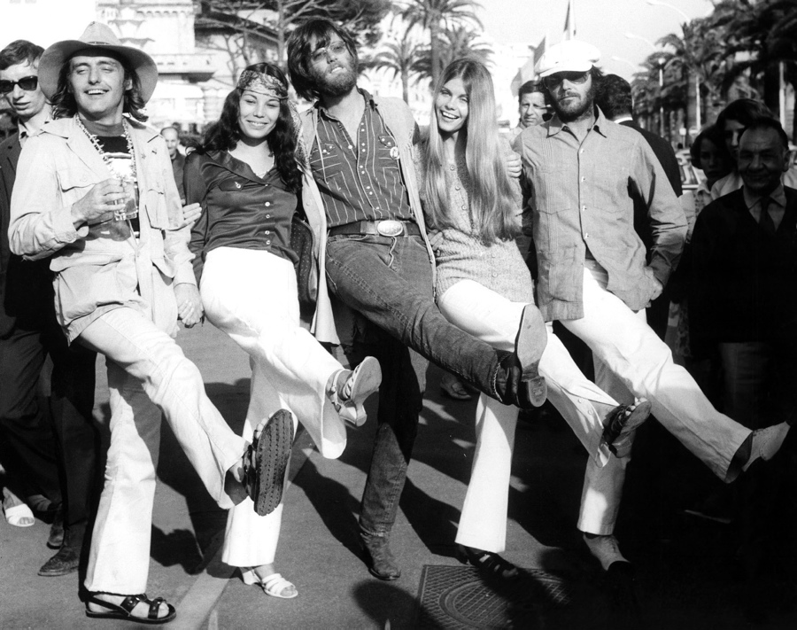 “Easy Rider” stars Dennis Hopper, Peter Fonda and Jack Nicholson take it easy with two lovely ladies at Cannes in 1969. The counterculture biker film won Dennis Hopper the Best First Work Award at Cannes that year.
